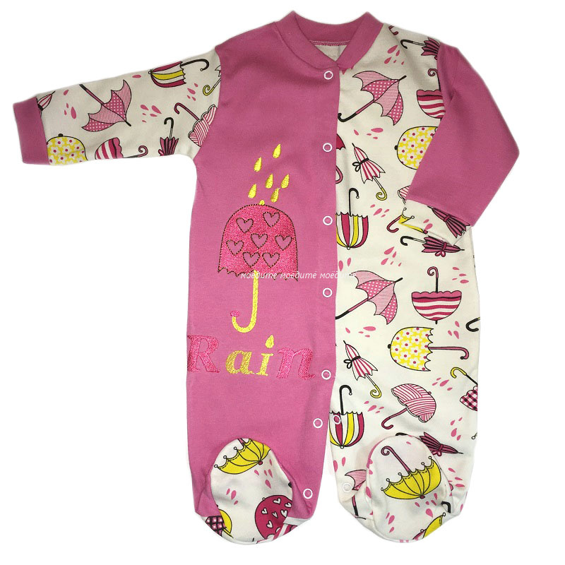 Комбинезон с длинным рукавом на манжетиках, с закрытыми ножками, без воротничка, спереди и между ножек на кнопочках. Спереди комбинезон украшен вышивкой на одной полочке. Расцветки и рисунки в каждой партии и в каждой упаковке отличаются.
