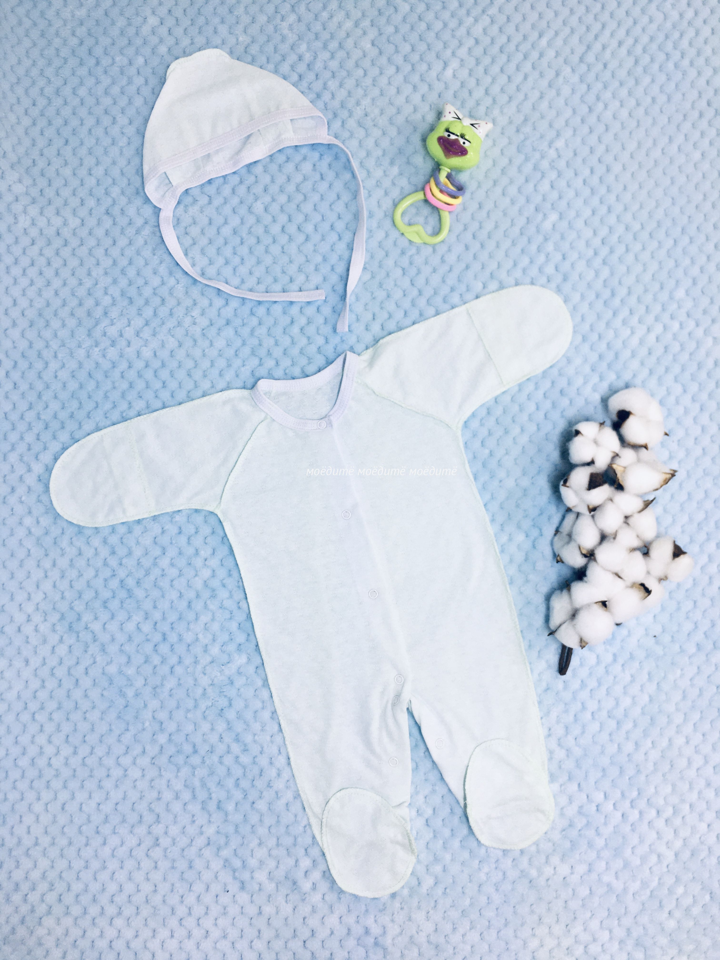 Комплект состоит из комбинезона без воротничка, с закрытыми ножками, рукавчики с царапками, спереди и между ножек на кнопочках и чепчика на завязках. Все швы у комплекта выполнены наружу.